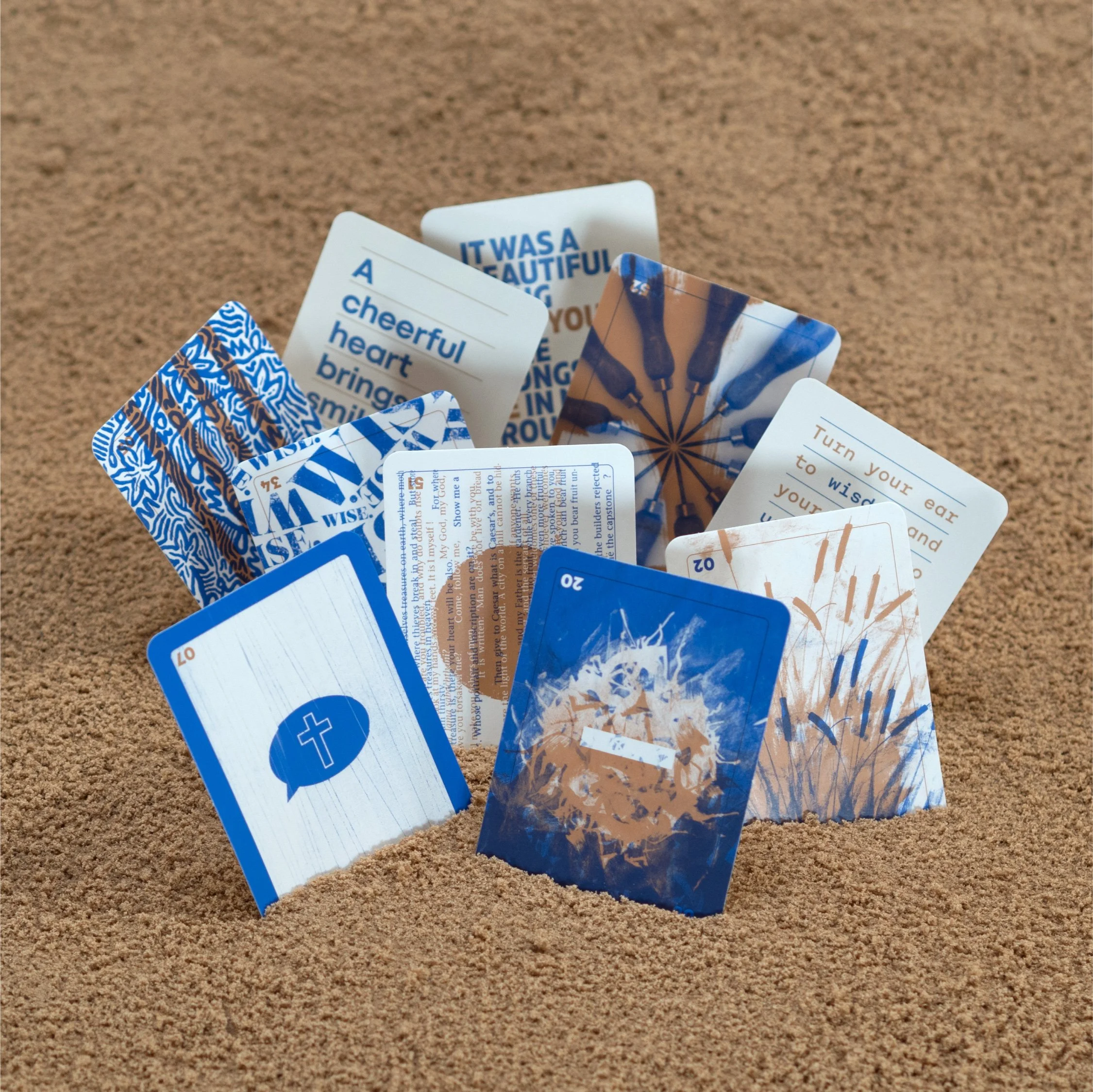 Each card containing a phrase or verse on one side and a unique graphic on the reverse inspired by the text and providing space for further contemplation.